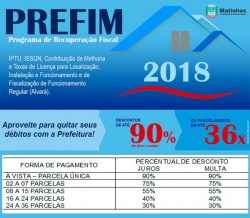 A PREFEITURA DO MUNICÍPIO DE MATINHOS – PR vem a público dar PUBLICIDADE aos contribuintes municipais que foi promulgada a Lei Municipal nº 1945/2018, com vigência até 28/09/2018, que institui o Programa de Recuperação Fiscal – PREFIM 2018 para promover a recuperação de débitos relativos a tributos municipais com os fatos geradores ocorridos até 31 de dezembro de 2017.