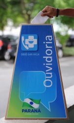 FORMULÁRIOS – A estrutura itinerante estará identificada com um guarda-sol azul e uma urna com o logotipo da Ouvidoria do SUS no Paraná. Dois ouvidores serão responsáveis pelo atendimento aos usuários e darão apoio ao preenchimento dos formulários. O documento será depositado na urna e registrado no Sistema Integrado de Gestão de Ouvidorias do Paraná (Sigo).