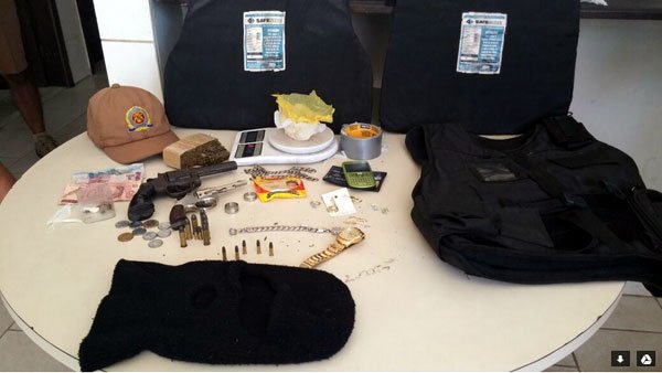 Os policiais se deslocaram até a casa, que tinha somente uma cama, e durante buscas encontraram um revólver calibre 22, sete munições do mesmo calibre, oito munições para calibre 38, um colete balístico, 51 gramas de cocaína, 221 gramas de maconha, uma touca balaclava, uma balança de precisão, um relógio e R$ 27,00 em dinheiro.