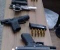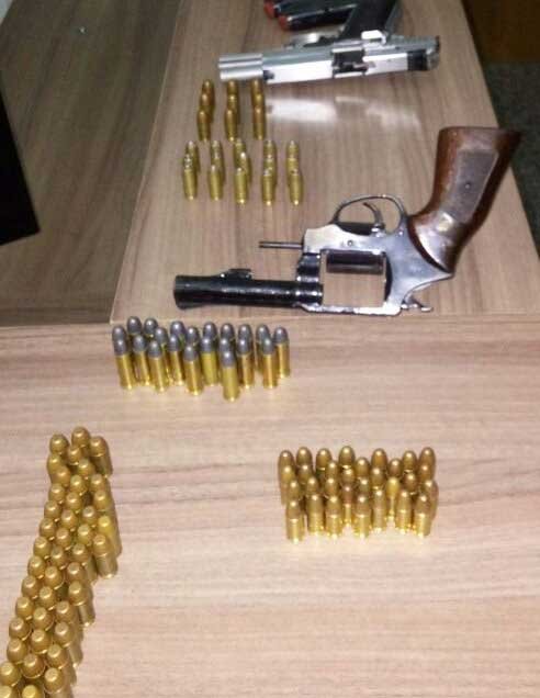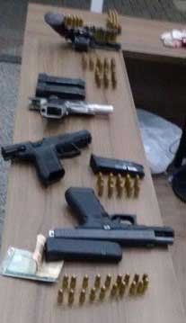 Durante as buscas foi encontrado em uma das mochilas quatro armas de fogo, 01 pistola CZ Cal.9mm de porte e uso restrito carregada com 15 munições, 01 pistola Glock Cal. 9mm de porte e uso restrito carregada com 19 munições, 01 pistola Taurus Cal. .40 com numeração suprimida também de porte e uso restrito, carregada com 15 munições e mais um carregador sobressalente com 09 munições, 01 revolver Rossi com numeração suprimida carregado com 06 munições, além do armamento apreendido, a policia ainda localizou outras 42 munições de Cal..40, 30 de Cal. 9mm, 15 de Cal. 38.