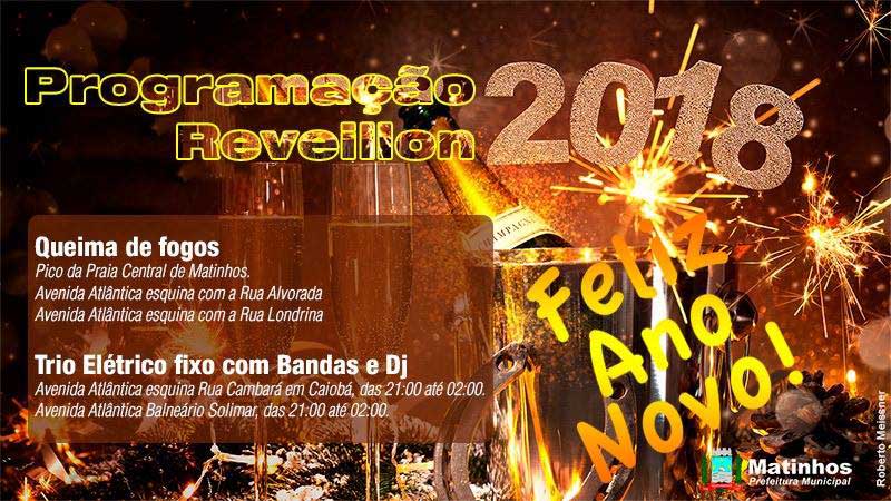 A Prefeitura de Matinhos, através da Secretaria de Turismo e Desenvolvimento Econômico, definiu a programação para o Réveillon 2018. Serão três pontos de Show Pirotécnico (queima de fogos), na praia, com duração entre 12 e 15 minutos, além disso, haverá dois trios elétricos fixos.