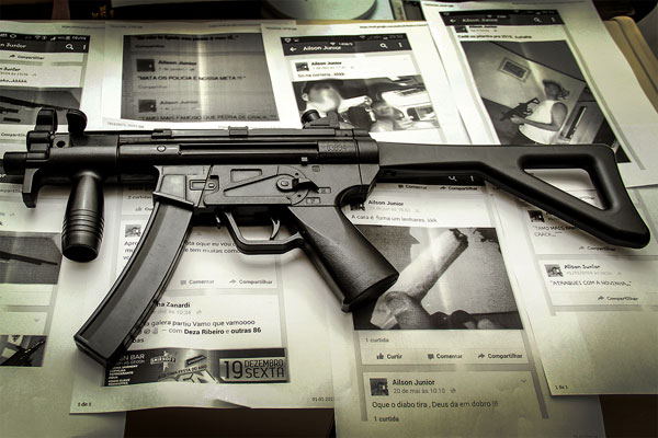 Um rapaz foi conduzido à delegacia, na noite desta quarta-feira (31/12/2014), por suspeita de apologia ao crime após postar fotos de armas em uma rede social. Na ação, desencadeada por policiais militares atuantes na “Operação Verão Paraná 2014/2015”, subárea de Matinhos (PR), litoral do estado, um simulacro de submetralhadora foi apreendido.