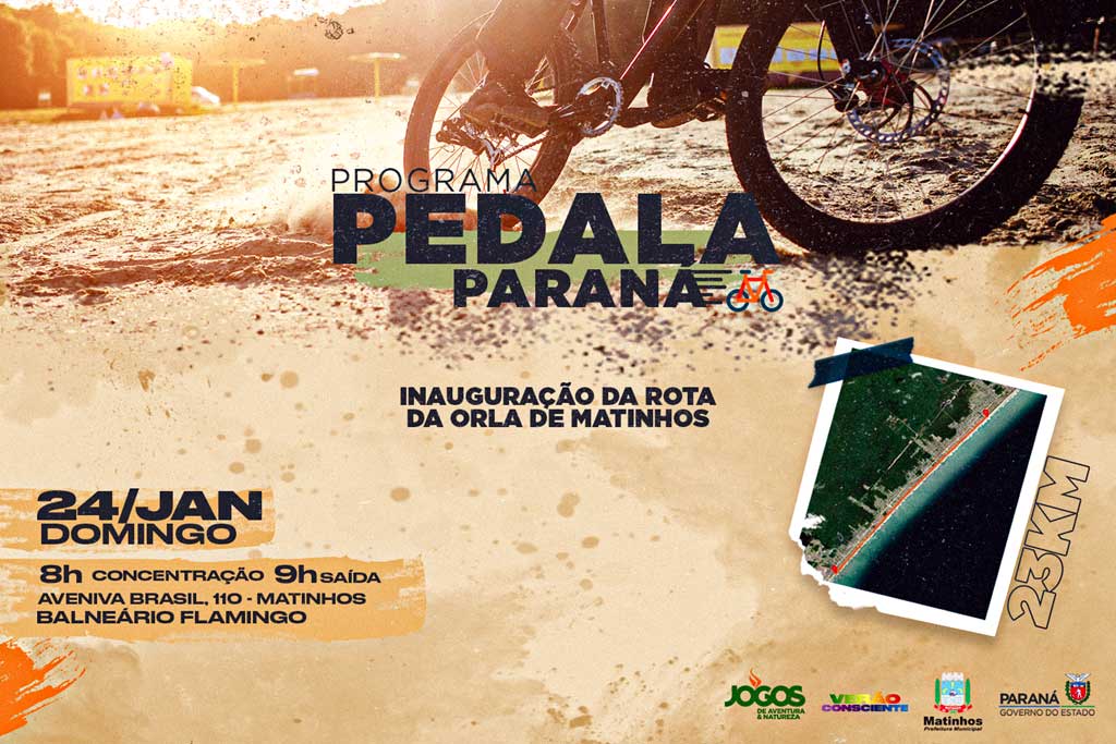 A segunda ciclorrota do Pedala Paraná será inaugurada neste domingo, dia 24/01/2021, em Matinhos. O percurso tem um total de 23km de ida e volta, de baixa intensidade, percorridos entre a orla do balneário Flamingo e o balneário Gaivotas. A largada está programada para às 9h, seguindo todos os protocolos de prevenção ao coronavírus.